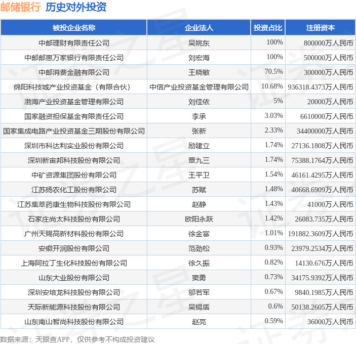 本站消息,根据天眼查APP显示,邮储银行(601658.SH)新增一起对外投资事件,被投资公司为上海步科自动化股份有限公司,法定代表人唐咚牛股动力,投资占比为0.56%。该公司从事专业技术服务业,注册资本为8400万人民币。目前,邮储银行共存在对外投资31项,投资占比前20的项目见下表:
