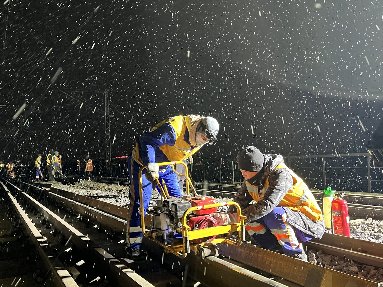 王岗站与哈南站间的王孙线为国铁哈尔滨局集团公司哈尔滨工务段管辖,是哈尔滨南部地区物流运输的重要通道。图为10月15日凌晨2点30分神牛资讯,哈尔滨工务段职工冒雪在王孙线进行更换钢轨作业。(工人日报客户端记者 张世光 通讯员 方琪 实习生 杜可心)