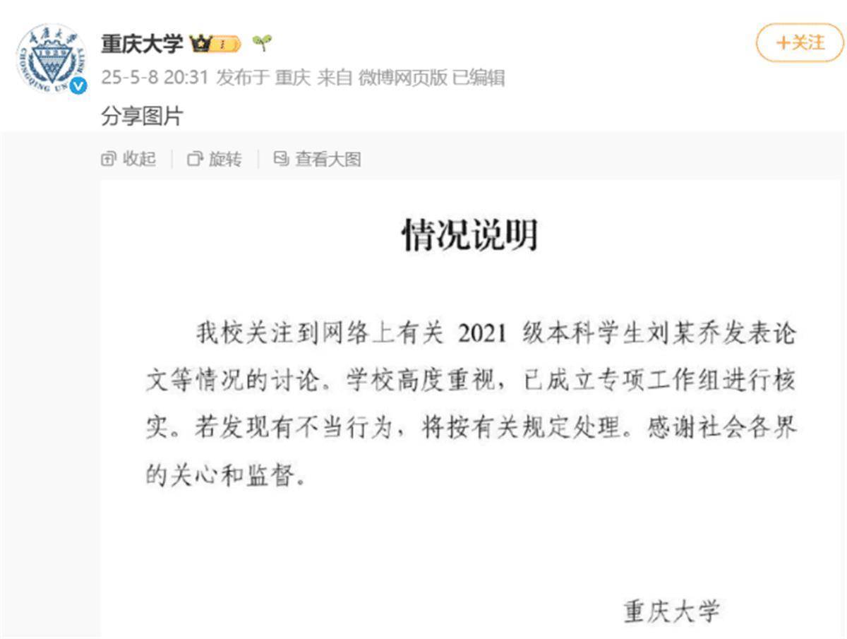 网友的热切关注,反映出公众对学术诚信和社会公平的深切期待,大家并不仅是简单地质疑刘某乔个人的“开挂履历”,而是透过这一不合常理的怪象审视学术界的伦理规范和透明度。论文署名权不能沦为私相授受的工具,学术成果更不应拿来随意给人“镀金”,重庆大学既然要介入调查,就不能只查本科生刘某乔,她背后的刘某华、刘某龙也要一并彻查,如果真查出有问题,更不能含含糊糊地撤稿了事,而要公开调查细节,严格依规处理,接受社会监督,坚决抵制任何形式的学术不端,否则,高校的公信力何在?学术的尊严何存?